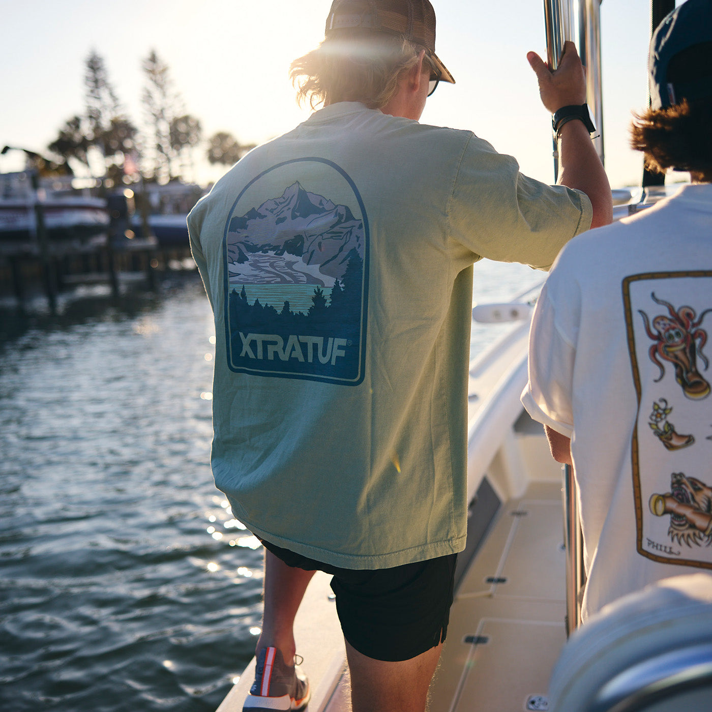 The Mountain Landscape Pocket Tee features a front chest pocket and a mountain landscape graphic on the back. Available in S-XXL.