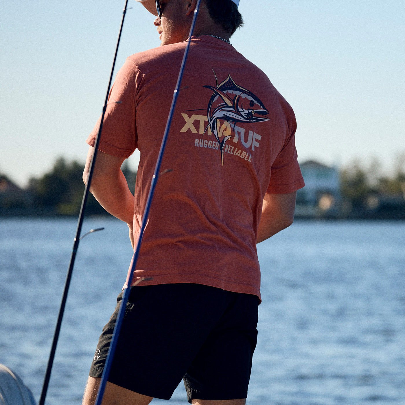The Xtratuf short sleeve tee comes in a Tawny Orange color and features a Xtratuf logo on the left side of the chest with aYellowfin Tuna graphic on the back. Available in sizes S-XXXL.