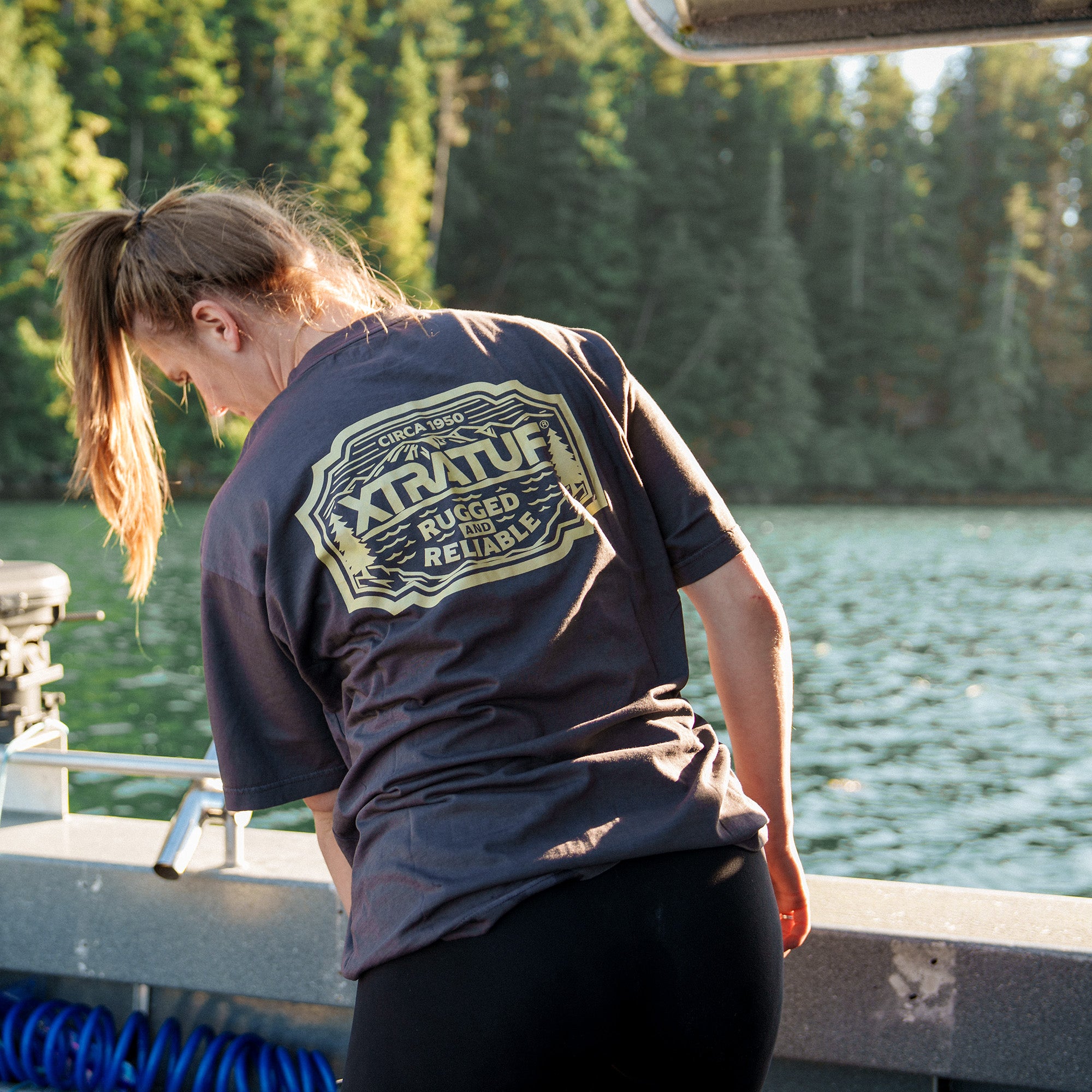 The XTRATUF Rugged and Reliable badge tee features an XTRATUF logo on the front and badge design on the back. Available in multiple colors and in sizes S-XXL.