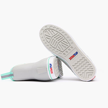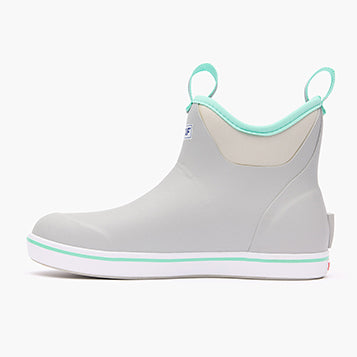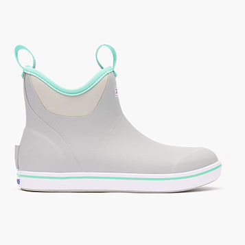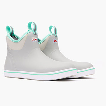 The Ankle Deck Boot collection has been crafted specifically for Off-Shore anglers. Anglers are athletes. and like any athlete they need the best footwear to help them perform at a high level. We’ve created a lightweight design with the same slip-resistant Chevron outsole found in our Legacy boots. The performance ankle deck boot is the perfect boot for any on the water athlete looking for protection with slip-on-and-go styling. This Light Gray boot features a complementary seafoam detail at the sole. pull-tabs and top lining for added style.