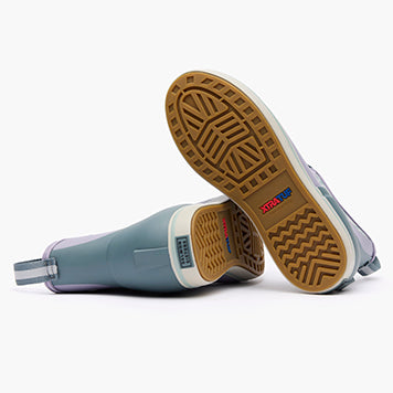 The Ankle Deck Boot collection has been crafted specifically for Off-Shore anglers. Anglers are athletes. and like any athlete they need the best footwear to help them perform at a high level. We’ve created a lightweight design with the same slip-resistant Chevron outsole found in our Legacy boots. The performance ankle deck boot is the perfect boot for any on the water athlete looking for protection with slip-on-and-go styling. This Lavender Gray boot with a Halibut print features a complementary light blue detail at the sole. pull-tabs and top lining for added style.