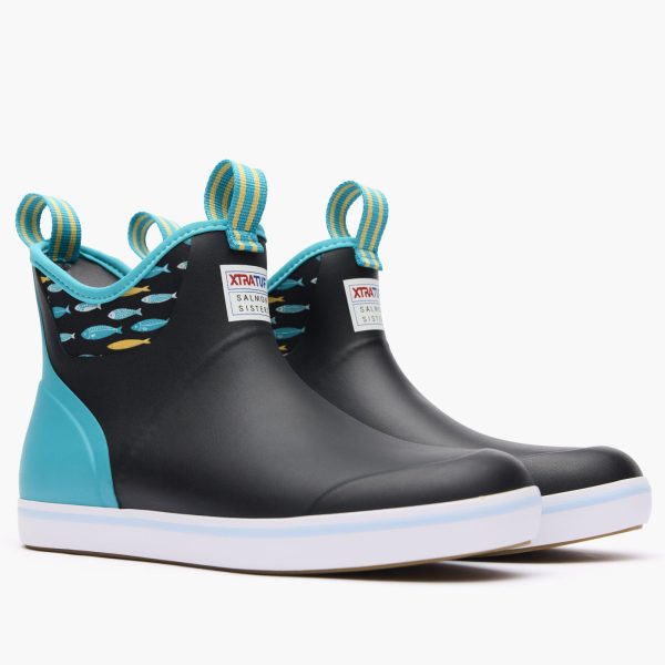 A fresh take on a classic. this version of the Women’s Ankle Deck Boot features an exclusive Tails and Scales print designed by The Salmon Sisters. Emma and Claire. The Salmon Sisters are two young commercial fishermen who create designs inspired by their life in Alaska and the Pacific Northwest. Made to be worn on the deck. on the dock. or wherever the day takes you. You can feel confident when you’re on the move. This lightweight silhouette offers the same non-marking. slip-resistant Chevron outsole as our iconic Legacy Boot. worn by commercial fishermen on the Bering Sea.